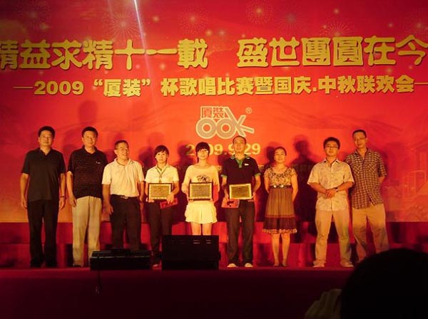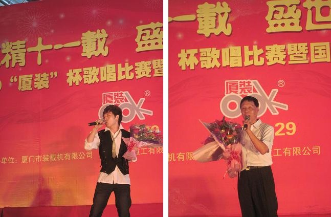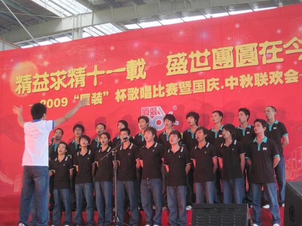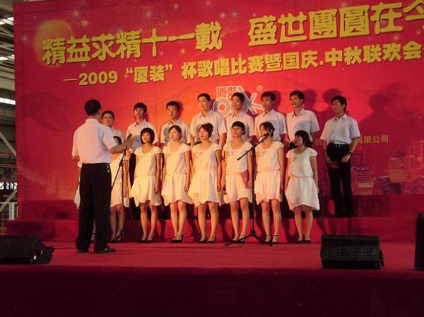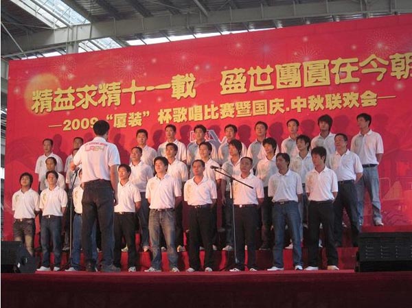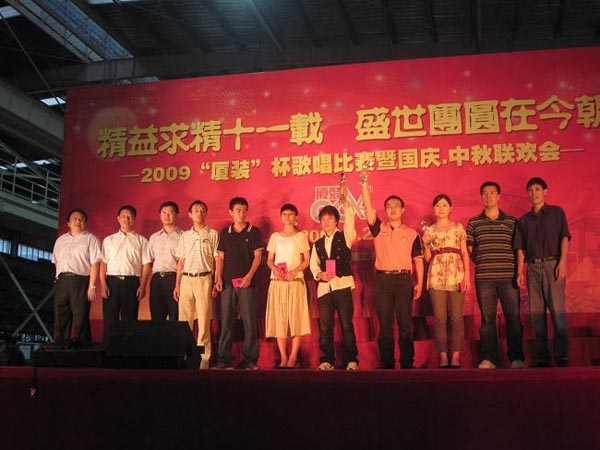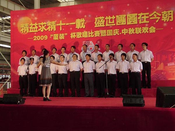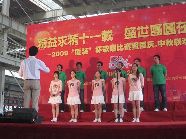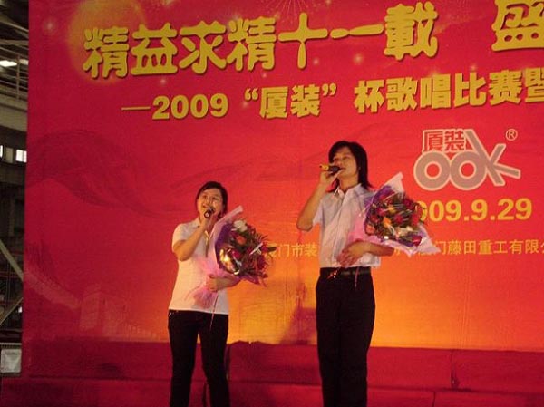 9月29日下午,2009年度“廈裝杯”歌唱比賽在廈裝公司總裝車(chē)間舉行。此次歌唱比賽以“精益求精十一載、盛世團(tuán)圓在今朝”為主題,賀祖國(guó)60周年華誕、喜迎中秋、慶祝廈裝成立11周年。公司及各部門(mén)從6月份開(kāi)始籌備此次比賽,此次比賽分為集體組和個(gè)人組,集體組(合唱)以部門(mén)為單位,最終有6支隊(duì)進(jìn)入當(dāng)天的決賽,個(gè)人組通過(guò)先前的部門(mén)推薦及預(yù)賽選拔,最終有11人闖入決賽。